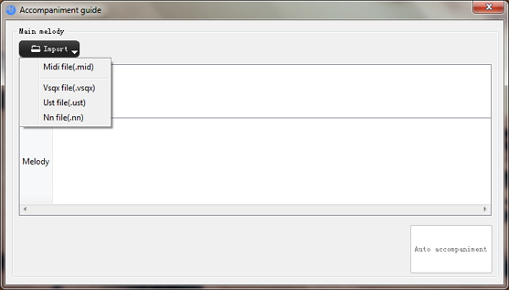 Click Import button and choose the format of the melody which you want to import. AthTek DigiBand supports four types of formats - .mid, .vsqx, .ust, and .nn.